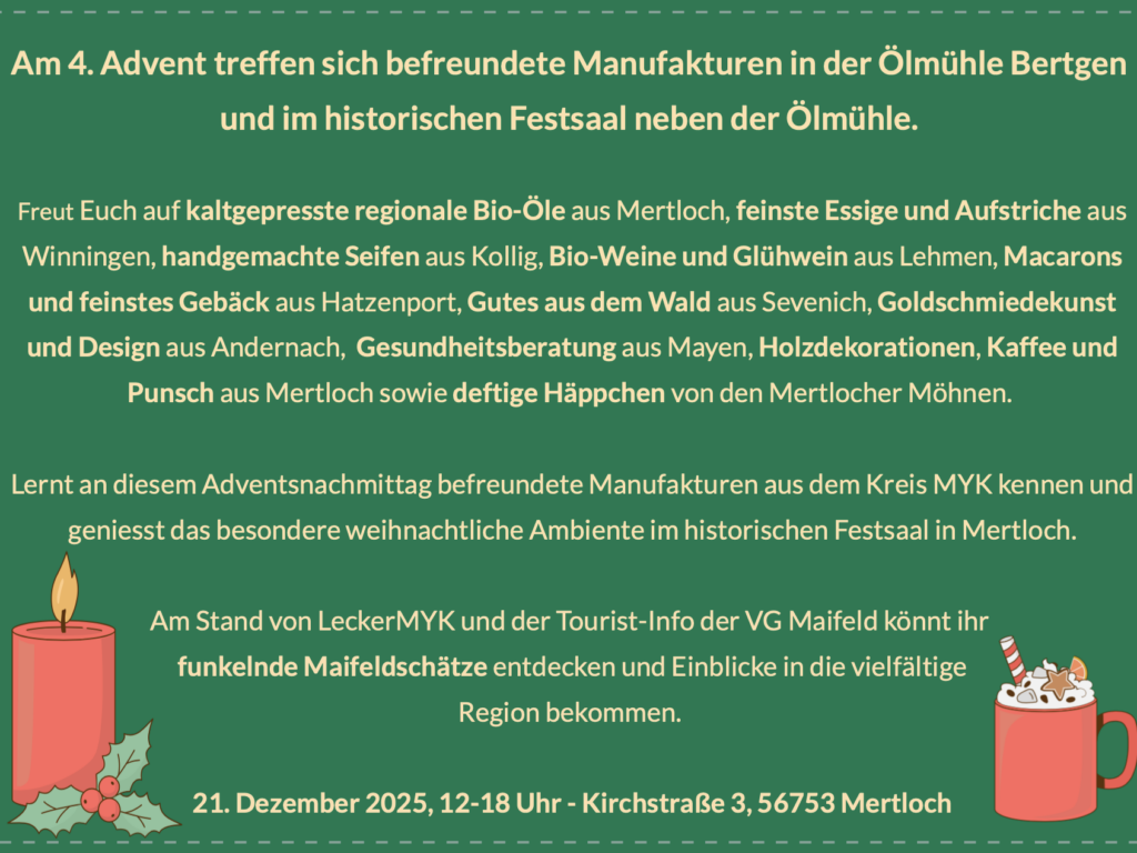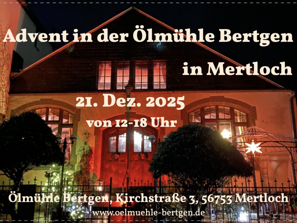 Liebe Kunden und Freunde der Ölmühle Bertgen. Am 21. Dezember 2025 laden wir von 12-18 Uhr zum Adventsmarkt in die Ölmühle ein. Wir…